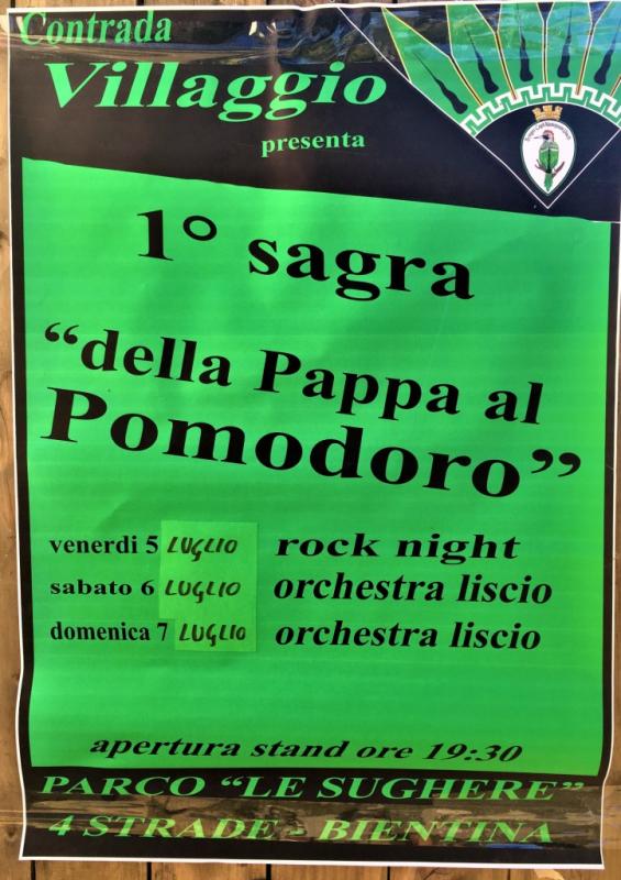 La Contrada Villaggio organizza nei giorni 5 e 6 Luglio 2019 la Sagra della Pappa al Pomodoro presso il Campo Sportivo Comunale Via L. da Vinci.