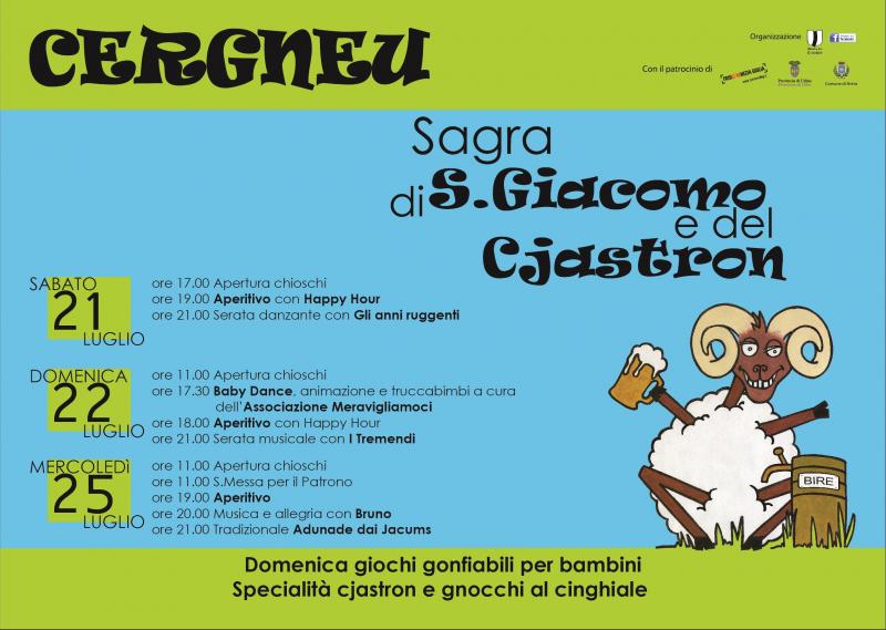 Un altro ricco programma di festeggiamenti vi aspetta a Cergneu, che per la festa del patrono San Giacomo propone tre giornate di festeggiamenti, il 21, 22 e 25 luglio.
