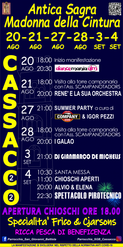Diniego di responsabilià: le notizie riportate in questa pagina sono state fornite da Enti Pubblici e Privati e, organizzazione eventi e sagre, fiere. Suggeriamo di verificare date, orari e programmi che potrebbero variare, contattando le organizzazioni o visitando il sito ufficiale dell'evento.