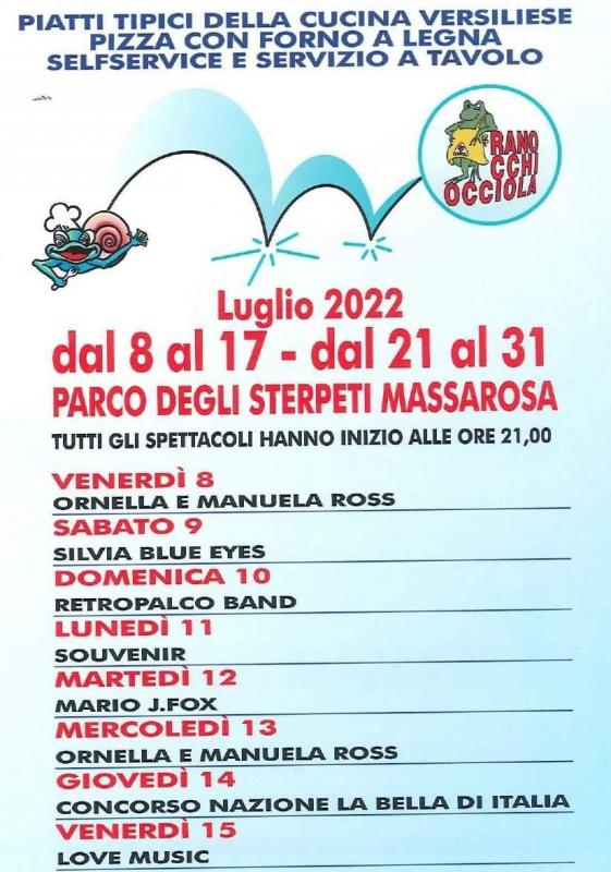La sagra della Ranochiocciola, a cura del gruppo Donatori di Sangue Fratres Massarosa, si svolge quest'anno tutte le sere dal 8 al 17 e dal 21 al 31 Luglio 2022 al Parco degli Sterpeti.