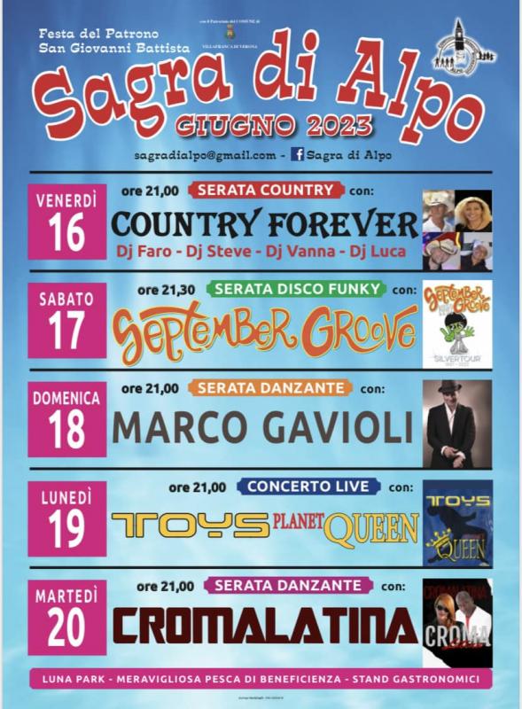 Sagra di Alpo, frazione del comune di villafranca (VR) la Festa del patrono San Giovanni Battista dal 16 al 20 Giugno 2023, tutte le sere stand gastronomici, luna park , giostre per bambini, pesca di beneficenza.