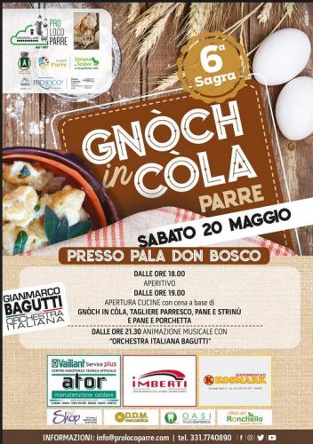 SABATO 25 MAGGIO parte la “Sagra degli Gnòch in Còla” che valorizza un’antica ricetta tipica delle nonne parresi, realizzata con prodotti poveri e semplici, ma che creano un mix gustoso.