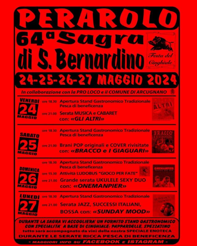 La Sagra di Perarolo , la sagra di san Bernardino quest'anno si svolge dal 24 al 27 Maggio 2024.