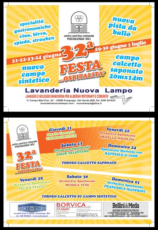 La 32^ Festa Ospitalità si svolge a Pozzolengo (BS) presso centro sportivo comunale dal 21 al 24 giugno e dal 29 giugno all'1 luglio 2018.