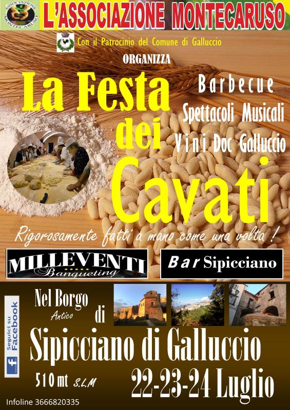 L'Associazione Montecaruso con il patrocinio del Comune di Galluccio, organizzano la seconda edizione della " Festa dei Cavati " che si svolgerà il 22 - 23 - e 24 Luglio 2016. nel Borgo antico di Sipicciano di Galluccio (Ce) ad un'altitudine di 510 Mt S.l.m