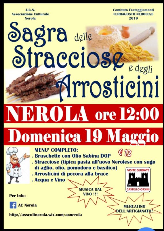 Venite a scoprire i sapori tipici della sabina, le bellezze di un bellissimo borgo medievale. Durante la sagra, potrete degustare un menù composto solo da prodotti locali. Il nostro menù sarà composto da un piatto di stracciose (piatto tipico nerolese) condite con sugo di aglio, olio, pomodoro e basilico, arrosticini e bruschette con olio DOP nerolese, compreso nel menù una bottiglia d'acqua ed un bicchiere di vino.