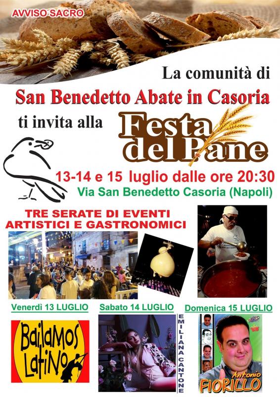 "Festa del Pane", una sagra incentrata su prodotti tipici locali che avranno come ingrediente principale il Pane. L'evento sarà svolto in uno dei centri storici di Casoria, in via San Benedetto, nei giorni 13, 14 e 15 Luglio a partire dalle ore 20.30. Oltre agli stand gastronomici, le tre serate saranno così articolate: Venerdì 13 serata Latina con gara di ballo salsa e bachata, Sabato 14 ospite d’eccezione la cantante Emiliana Cantone e Domenica 15 la Corrida con il comico e attore napoletano Antonio Fiorillo.