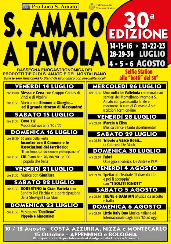 La 30a edizione di Sant'Amato a Tavola nella frazione di Sant'Amato, comune di Vinci (FI), si svolge nei fine settimana del 14, 15-16, 21, 22-23, 28, 29-30 Luglio, 4, 5-6 Agosto 2023.