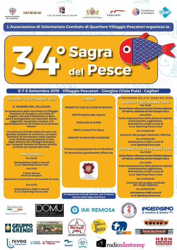 Il menù di questa trentaquattresima edizione, preparato per l’occasione dagli abitanti del Villaggio Pescatori secondo le tradizionali ricette cagliaritane, sarà composto dalle pennette alle cozze in bianco, dall’immancabile fritto misto (di diverse specialità di mare: calamari e totani, gamberetti, occhioncelli e altro), dall'insalata di mare (totani, polpa di granchio, cozze e seppie), dai muggini e sardine arrostiti alla brace e da “su pisci a collettu” (fave bollite), il tutto accompagnato dal vermentino gentilmente offerto dalla Cantina Locci Zuddas di Monserrato.