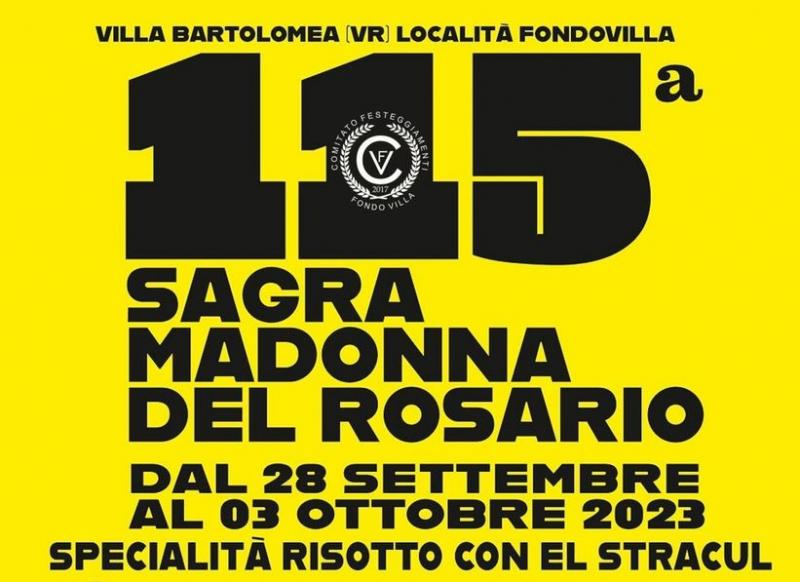 Il Comitato Festeggiamenti Fondovilla Bartolomea organizzano dal 28 Settembre al 03 Ottobre 2023 a Villa Bartolomea (VR), in Via Umbria, la "Sagra della Madonna del Rosario”, che prevede la presenza di Espositori delle Tradizioni Popolari, dell'Artigianato Artistico e delle Opere d'Ingegno Creativo con Curiose ed introvabili Idee Regalo per la Casa ed il Tempo Libero; bancarelle di Prodotti Enogastronomici Tipici Regionali d'Italia e Specialità Alimentari Dolci e Salate Stagionali; Prodotti e Rimedi Naturali per la Cura del Corpo e del Vivere Sano.