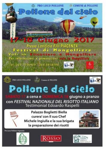 Sopra voleranno le mongolfiere, sotto si gusteranno i risotti del territorio. Questo il singolare abbinamento della fine settimana di sabato 17 giugno e domenica 18 ideato dallo staff della Pro Loco di Pollone (in provincia di Biella). Si tratta della settima edizione di Pollone dal Cielo.
