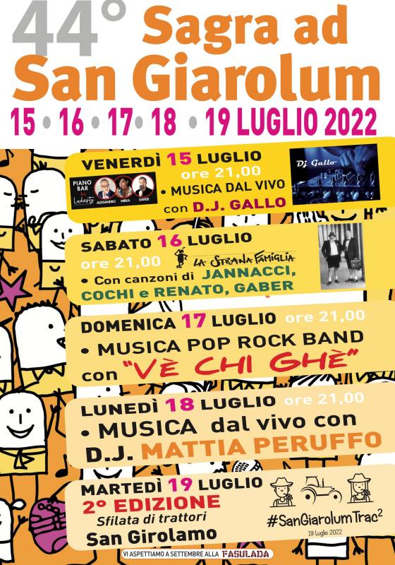 Comune di Guastalla e Associazione San Girolamo invitano alla 42^ edizione della Sagra di San Girolamo, in dialetto locale SAGRA AD SAN GIROLUM, che si svolge dal 15 al 19 luglio 2022.