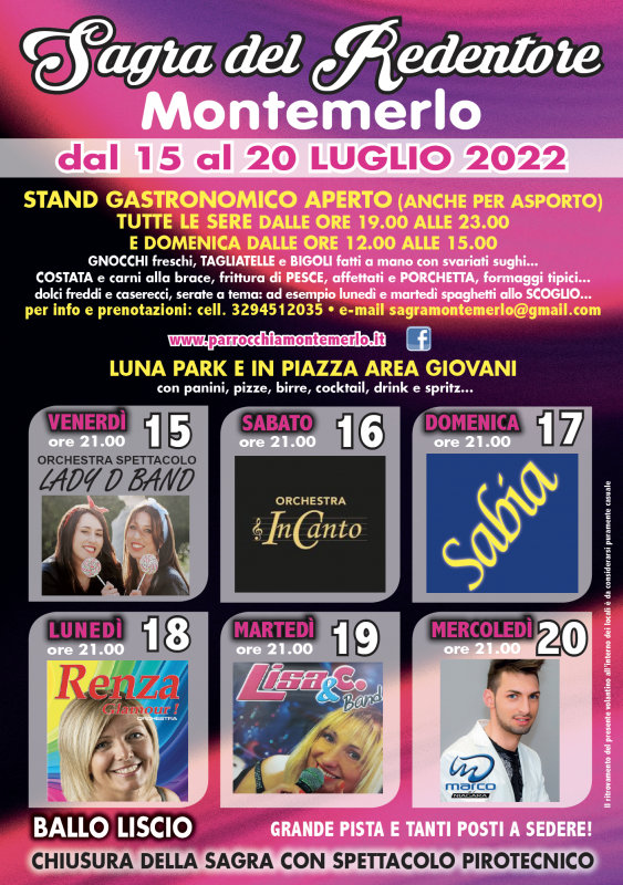 Torna la Sagra del Redentore a Montemerlo, frazione del Comune di Cervarese Santa Croce (PD), dal 18 al 23 luglio 2025