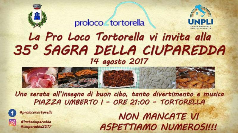 La 35° Sagra Della Ciuparedda si svolge il 14 agosto 2017 a Tortorella, in piazza Umberto I dalle ore 21:00, e sarà una serata all'insegna di buon cibo, tanto divertimento e musica.
