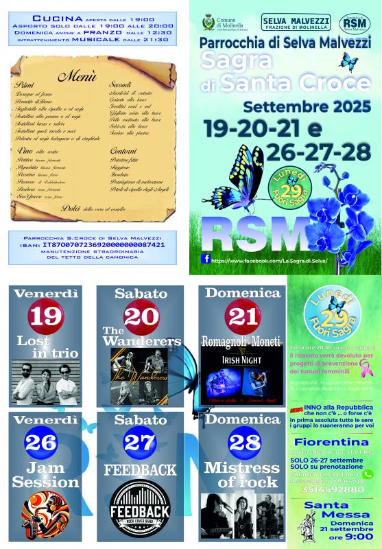 La sagra di Santa Croce a Selva Malvezzi ritorna anche quest'anno con alcune novità.Iniziamo con le date: venerdì 19, sabato 20 e domenica 21 settembre e venerdì 26, sabato 27 e domenica 28 settembre 2025.https://www.facebook.com/La.Sagra.di.Selva/tutte le sere apertura stand gastronomico ore 19:00anche domenica a pranzo ore 12:30