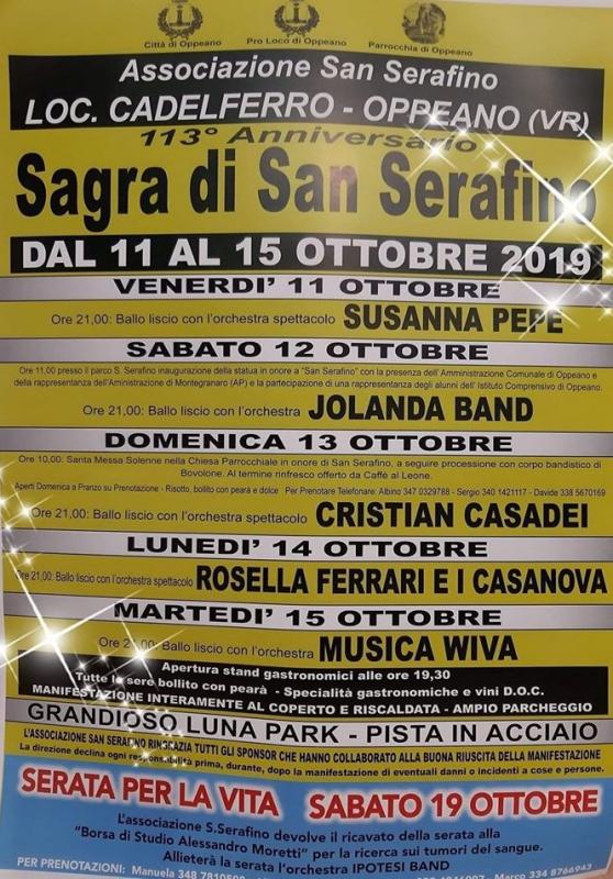 Dal 11 al 15 ottobre p.v. a Oppeano, in piazza Montegranaro, vicino al parco San Serafino di via Piave, si terrà la 113^ sagra di San Serafino. La sagra è patrocinata da Città di Oppeano, Pro Loco e Parrocchia e organizzata dal Comitato San Serafino.