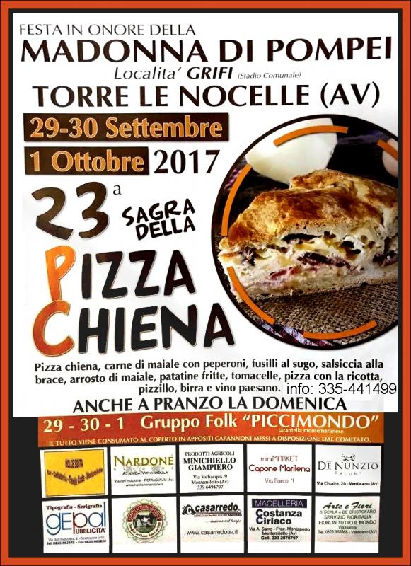 Dal 29 Settembre al 01 Ottobre 2017 a Torre Le Nocelle, nell'ambito della Festa in onore della Madonna di Pompei si terrà la 23a Sagra della Pizza Chiena.