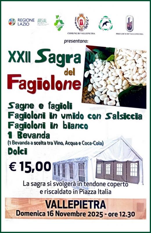 A Vallepietra in provincia di Roma si svolge nella giornata di Domenica 16 Novembre 2025 la Sagra del Fagiolone.