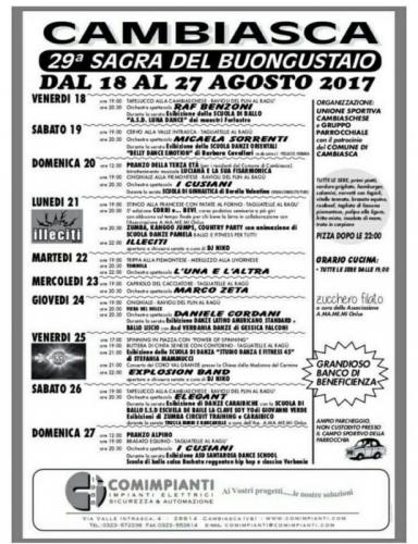 La 29^ edizione della Sagra del Buongustaio a Cambiasca si svolge dal 18 al 27 agosto 2017.