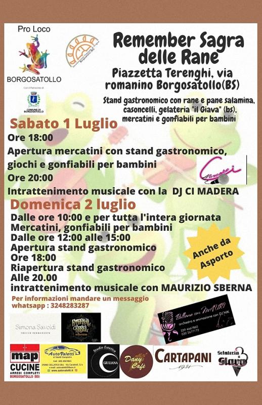 In Piazza Terenghi a Borgosatollo in provincia di Brescia si svolge nei giorni Sabato 01 e Domenica 02 Luglio 2023 la manifestazione Remember Sagra delle Rane.