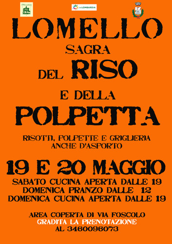 Sabato 19 e domencia 20 maggio 2018 si svolge la Sagra del riso e della polpetta a Lomello, presso l'area coperta di via Foscolo