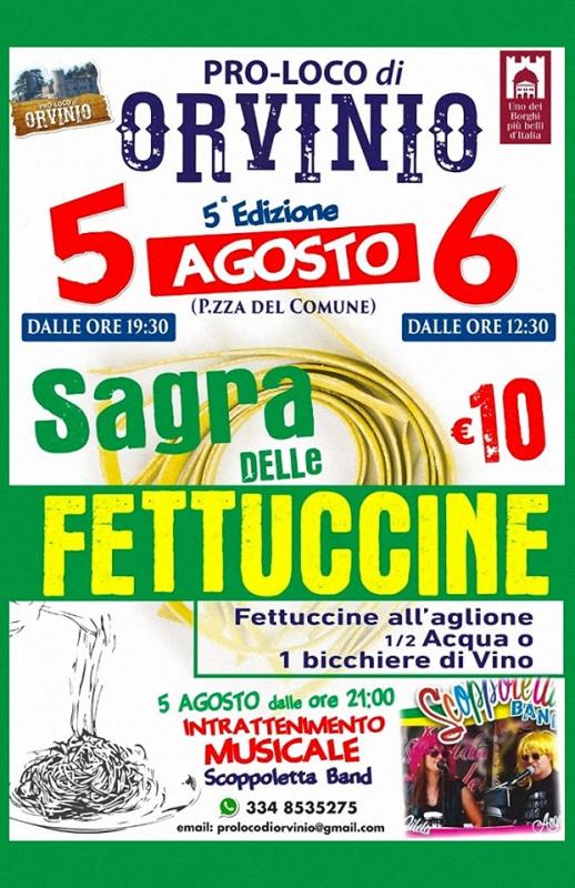 In Piazza del Comune ad Orvinio in provincia di Rieti si svolge nei giorni Sabato 05 e Domenica 06 Agosto 2023 la 5a Edizione della Sagra delle Fettuccine all'Aglione o Funghi Porcini.