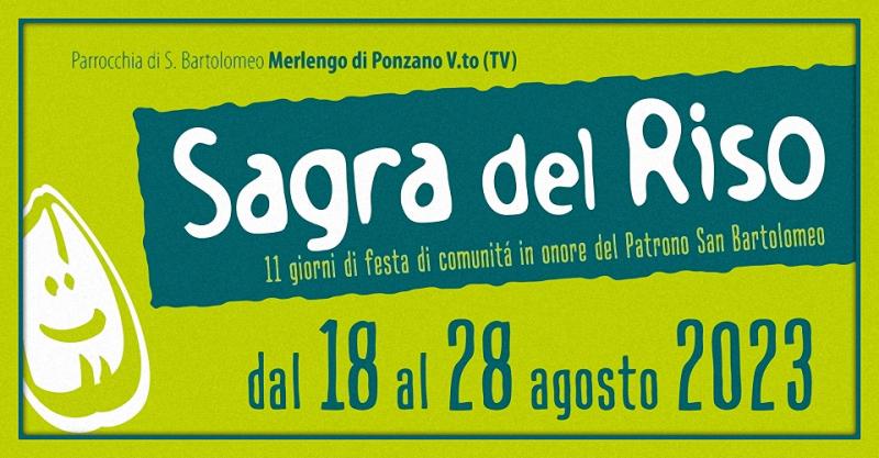 - ore 12.00 Pranzo Comunitario su prenotazione entro venerdì 25/08, presso le cassedella sagra, via mail a sagradelriso@gmail.com, con messaggio Whatsapp al 327.0515300 - Specialità del Riso: Osteria Varaschin (Merlengo di Ponzano)