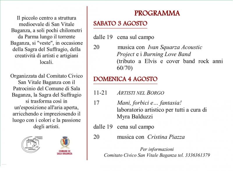 Organizzata dal Comitato Civico San Vitale Baganza con il Patrocinio del Comune di Sala Baganza, la Sagra del Suffragio si trasforma così in un'esposizione all'aria aperta, arricchendo e impreziosendo il luogo con i colori e la passione degli artisti.