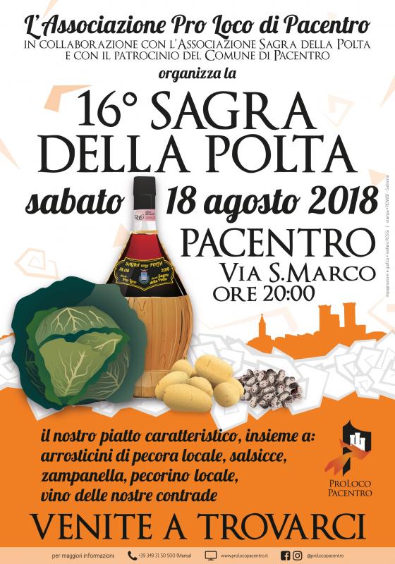 L’associazione Pro Loco Pacentro in collaborazione con l’associazione Sagra della Polta e con il patrocinio del Comune di Pacentro organizza la 16° edizione della Sagra della Polta, sabato 18 agosto, via San Marco a Pacentro.