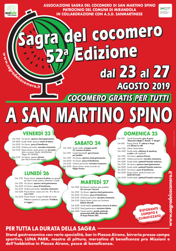 Torna dal 1 al 4 settembre 2023 a San Martino Spino frazione del comune di Mirandola (MO), il tradizionale appuntamento con la Sagra del Cocomero.