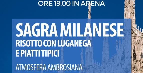 Sabato 17 Agosto 2019, all'Arena di Caglio, dalle ore 19.00 apre la nostra cucina con la serata milanese: risotto con la "luganega " ossibuchi, mondeghili, cotolette, e piatti tipici.