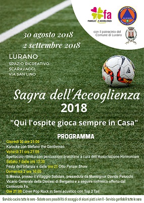 Il Consorzio Fa, con il patrocinio del Comune di Lurano, è lieto di invitarvi dal 30 agosto al 2 settembre alla Sagra dell’Accoglienza presso lo spazio ricreativo Scaravaggi di via San Lino (Lurano).