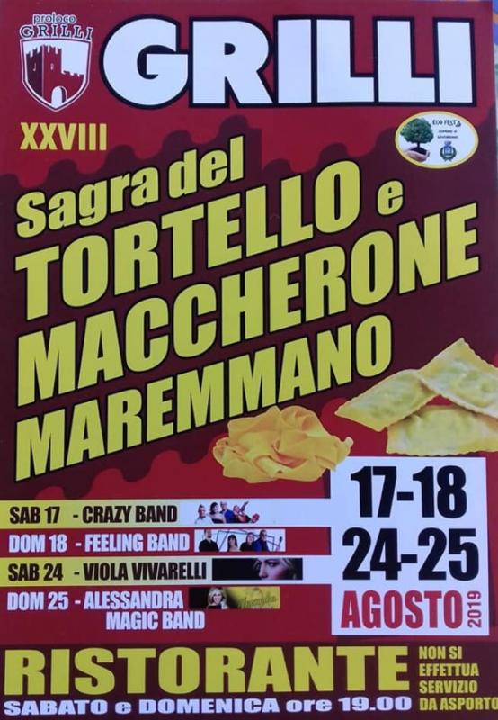 La Sagra del Tortello e del Maccherone Maremmano si svolge a Grilli nel comune di Gavorrano (Grosseto) nei giorni 17, 18, 24, 25 Agosto