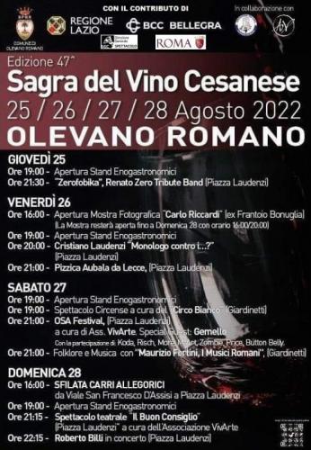 La Sagra del Vino Cesanese, alla 47a edizione, sta per tornare dal 25 al 28 Agosto 2022, a Olevano Romano, per tre giornate ricche di intrattenimento, arte, cultura, musica, compagnia, buon cibo e buon vino!