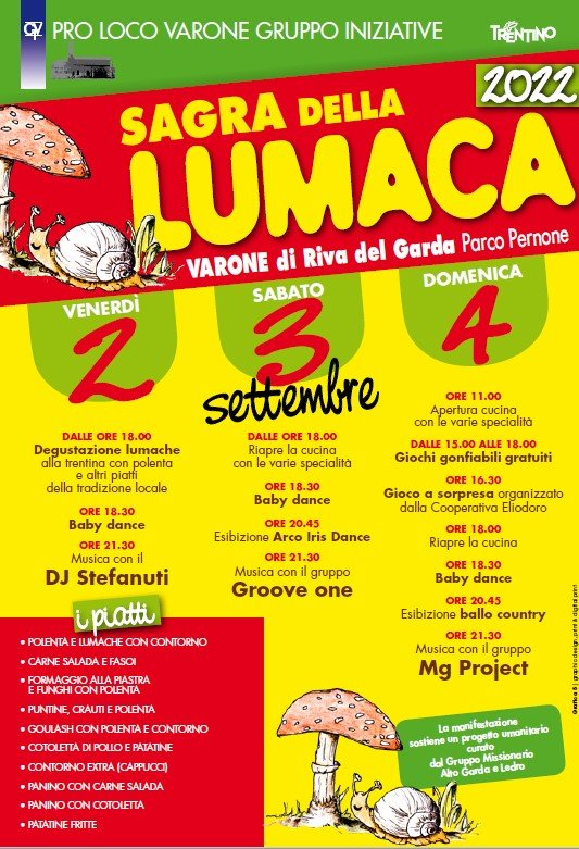Come ogni anno, da più di 20 anni, a Varone nel comune di Riva del Garda, si tiene la tradizionale ma non consueta Sagra della Lumaca, e si svolgera dal 2 al 4 Settembre , al Parco del Pernone