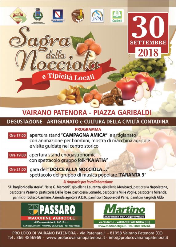 A Vairano Patenora in provincia di Caserta si svolge nella giornata di Domenica 30 Settembre 2018 la Sagra della Nocciola , dove degustazioni artigianato e cultura della civiltà contadina saranno di casa.