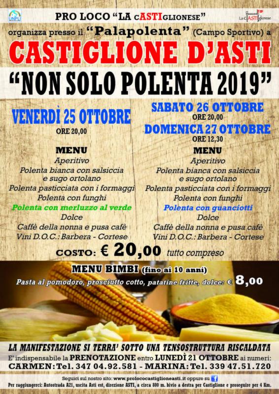A Castiglione d’Asti piccola frazione collinare a pochi Km. dal capoluogo nel ultimo fine settimana dal 25 al 27 Ottobre si svolgerà la 26° edizione della manifestazione gastronomica Non solo Polenta 2019.