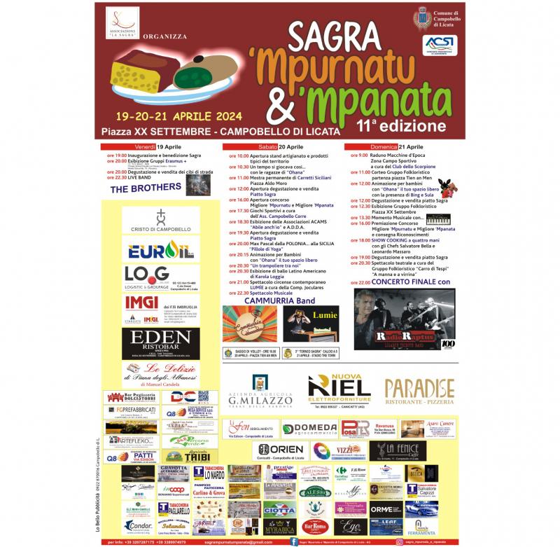 In Piazza XX Settembre a Campobello di Licata in provincia di Agrigento si svolge nei giorni dal 19 al 21 Aprile 2024 la 11a edizione de La Sagra di lu 'Mpurnatu e 'Mpanata.