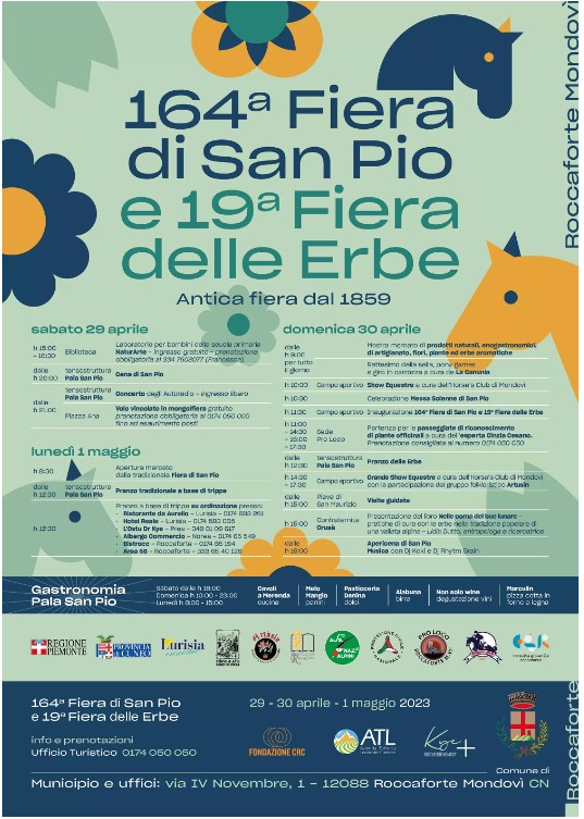 Nei giorni 29 aprile, 30 aprile e 01 maggio a Roccaforte Mondovì si svolgerà la 164^ Fiera di San Pio e la 19^ Fiera delle Erbe, con fiori, piante, cavalli, spettacoli, musica e buon cibo.