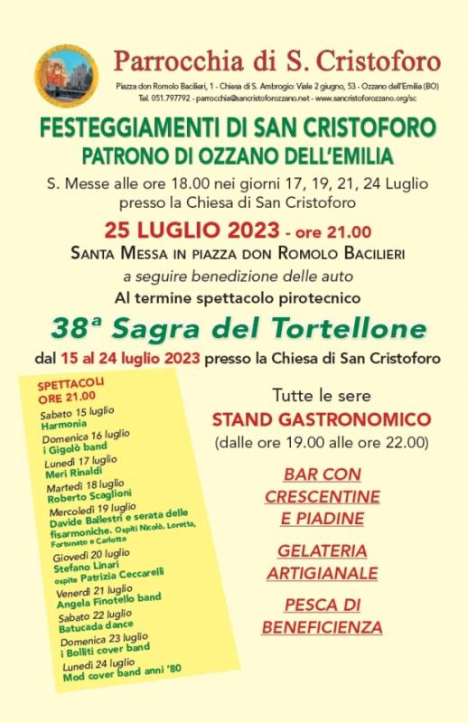 La sagra del tortellone di San Cristoforo (Festa Patronale: 25 Luglio 2023) è un appuntamento assolutamente da non perdere dedicato a tutti i buongustai ed agli amanti di questa pasta ripiena. Durante la sagra dalle 19.00 alle 22.00 si potranno gustare gli ottimi tortelloni di ricotta fatti in casa dalle sfogline ozzanesi, preparati con la tradizionale ricetta emiliana e conditi con ragù alla bolognese, burro e pomodoro o burro e salvia. Ogni sera dalle 21.00 musica e spettacoli.