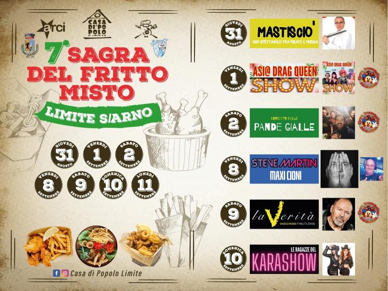 A Limite sull'Arno, frazione del Comune di Capraia e Limite in provincia di Firenze si svolge nei giorni 8,9,10,11Settembre 2023 la 7a edizione della Sagra del Fritto Misto.