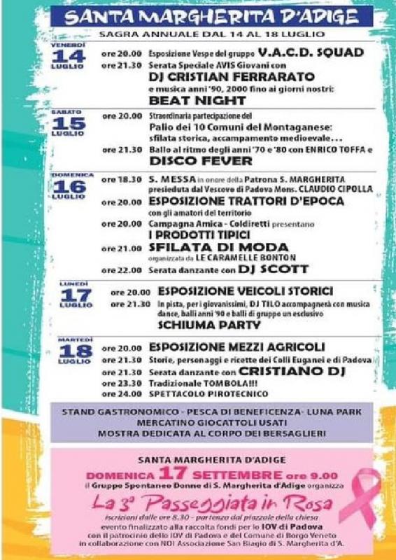 A Santa Margherita d'Adige, frazione del Comune di Borgo Veneto, in provincia di Padova si svolge nei giorni dal 14 al 18 Luglio 2023 la sagra Santa Margherita d'Adige in Sagra.
