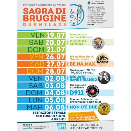 La Sagra di Brugine si svolge il 19, 20, 21, - 26, 28, 28 luglio e dal 2 al 6 agosto 2024 è una manifestazione annuale di musica, teatro, ballo, giochi, intrattenimento e soprattutto buona cucina