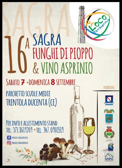A Trentola Duecenta in provincia di Caserta si svolge nei giorni 07 e 08 Settembre 2019 la 16a edizione della Sagra dei Funghi di Pioppo e Vino Asprinio.