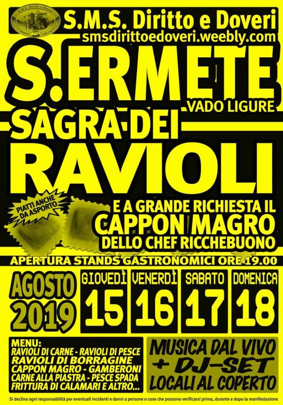 A Sant'Ermete, frazione del Comune di Vado Ligure in provincia di Savona si svolge nei giorni 15, 16, 17, 18 Agosto 2019 la Sagra dei Ravioli e a grande richiesta il Cappon Magro dello Chef Ricchebuono.