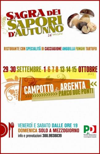 Presso il Parco Due Ponti a Campotto, frazione del Comune di Argenta in provincia di Ferrara si svolge nei giorni 29, 30 Settembre e 01, 06, 07, 08, 13, 14, 15 Ottobre 2023 la 24a Sagra dei Sapori d'Autunno.