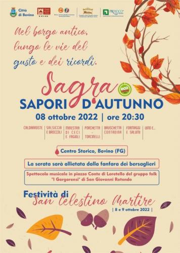 L’ Amministrazione Comunale, il Comitato Festa San Celestino Bovino e la Pro Loco Bovino Unpli vi invitano alla Sagra “Sapori d’ Autunno”, anche quest’anno ECOFESTA, in programma Sabato 8 Ottobre, a partire dalle 20.30.