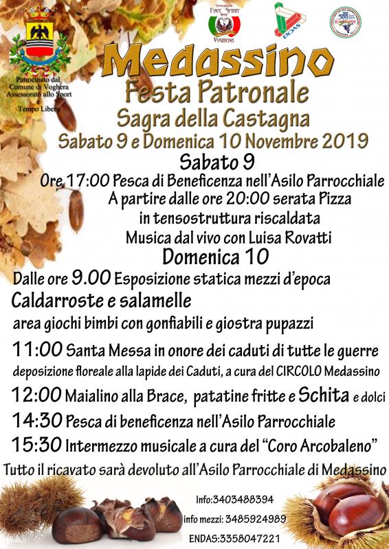 Nel fine settimana del 9 e 10 novembre 2019 si svolgono gli eventi della Festa del Patrono e della Sagra della Castagna a Medassino di Voghera.