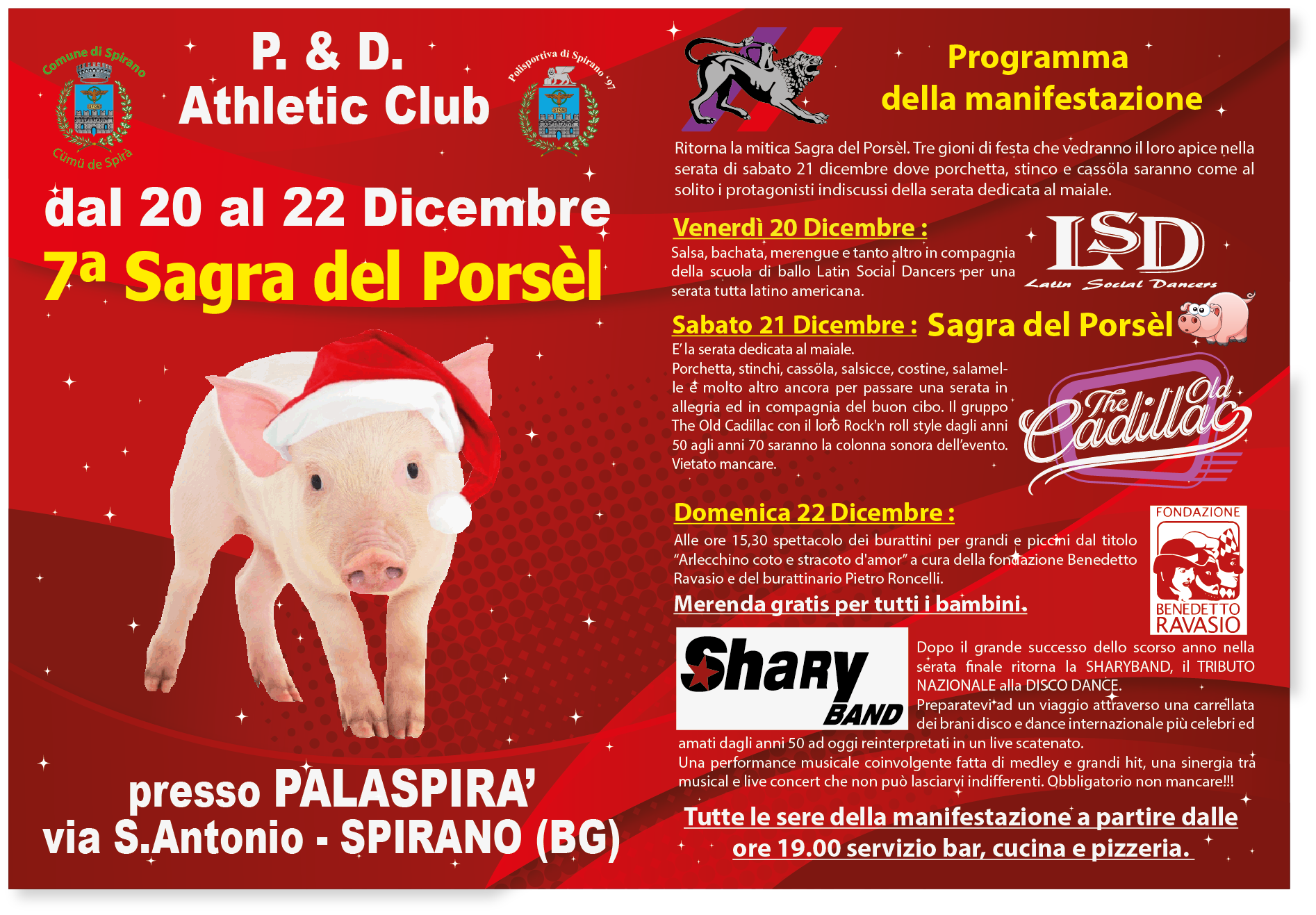 Venerdì 20 dicembre - serata latino-americana con i Latin Social Dancers.Sabato 21 dicembre - E’ la serata dedicata al maiale.
