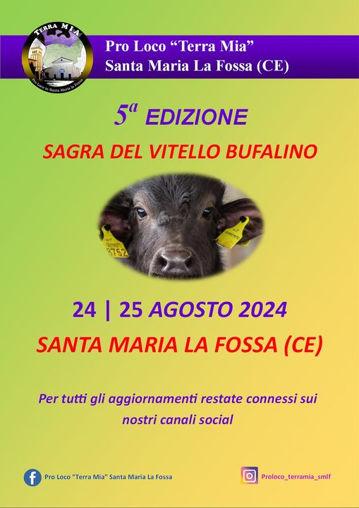 La ProLoco "Terra Mia" è lieta di annunciare la 5a edizione della Sagra del Vitello Bufalino che avrà luogo Sabato 24 e Domenica 25 Agosto 2024 a Santa Maria La Fossa (CE).